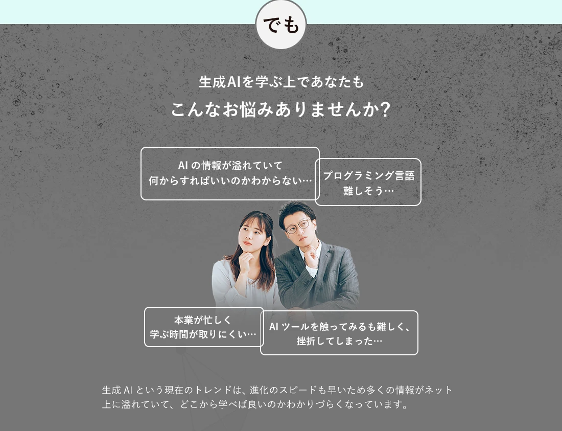 ですが生成AIは進化のスピードが早く情報がネットに溢れているため「何から学べばいいかわからない」と迷われる方が多くいます。