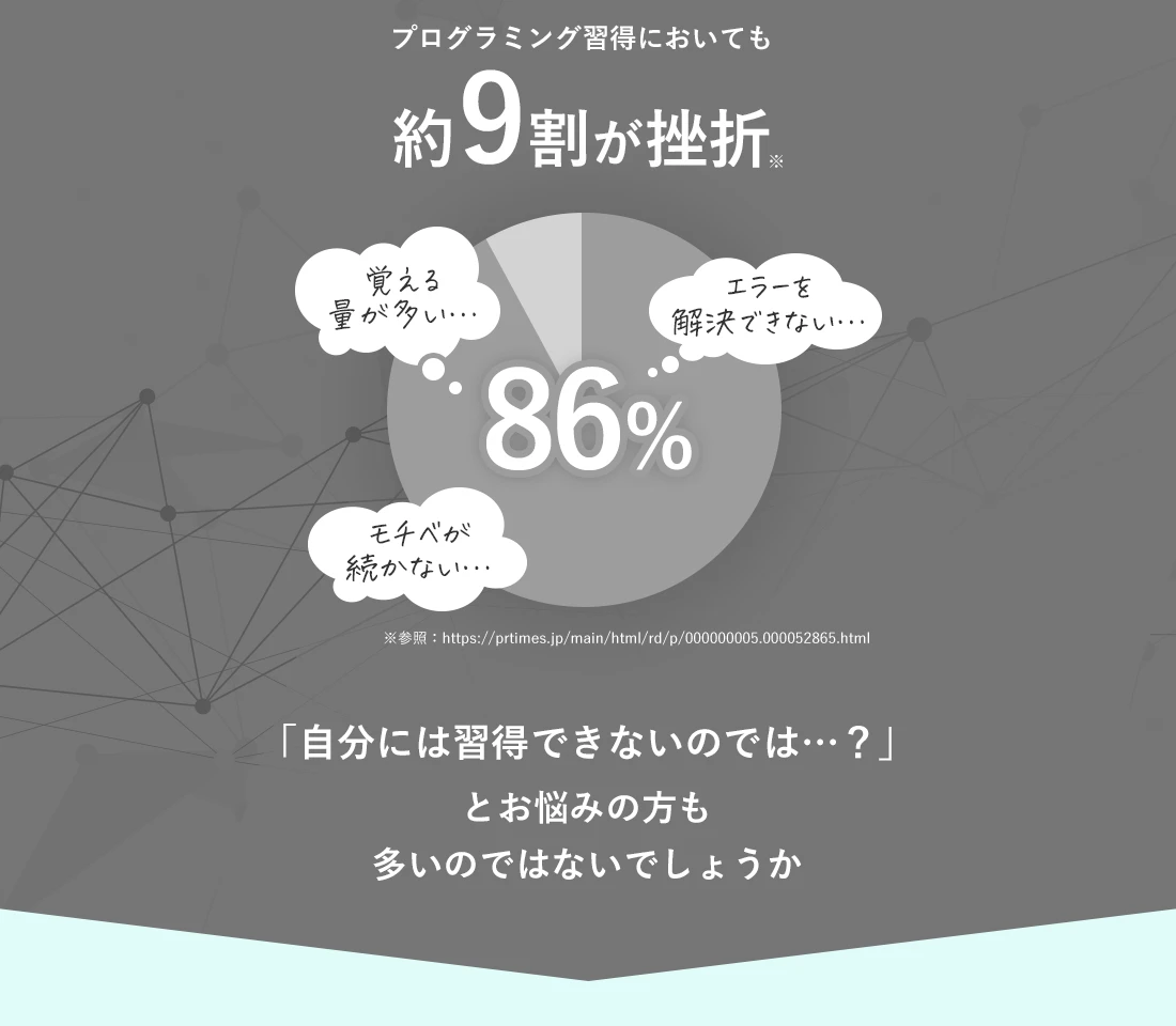 またプログラミングは「つまずいた時に相談できる人がいない」「エラーが解決しない」など挫折してしまう人が非常に多いです。
