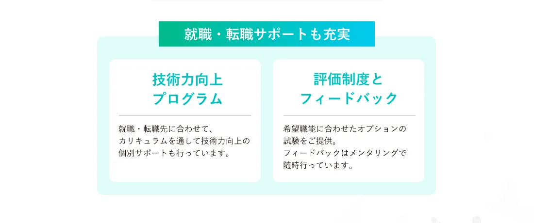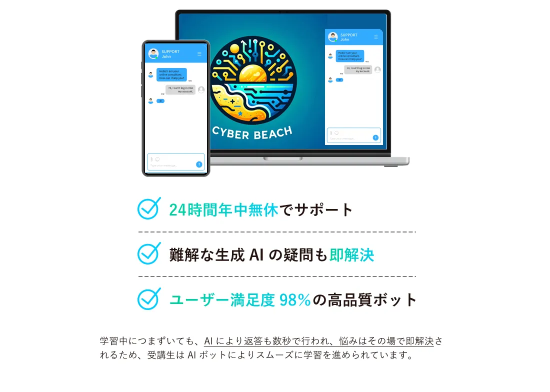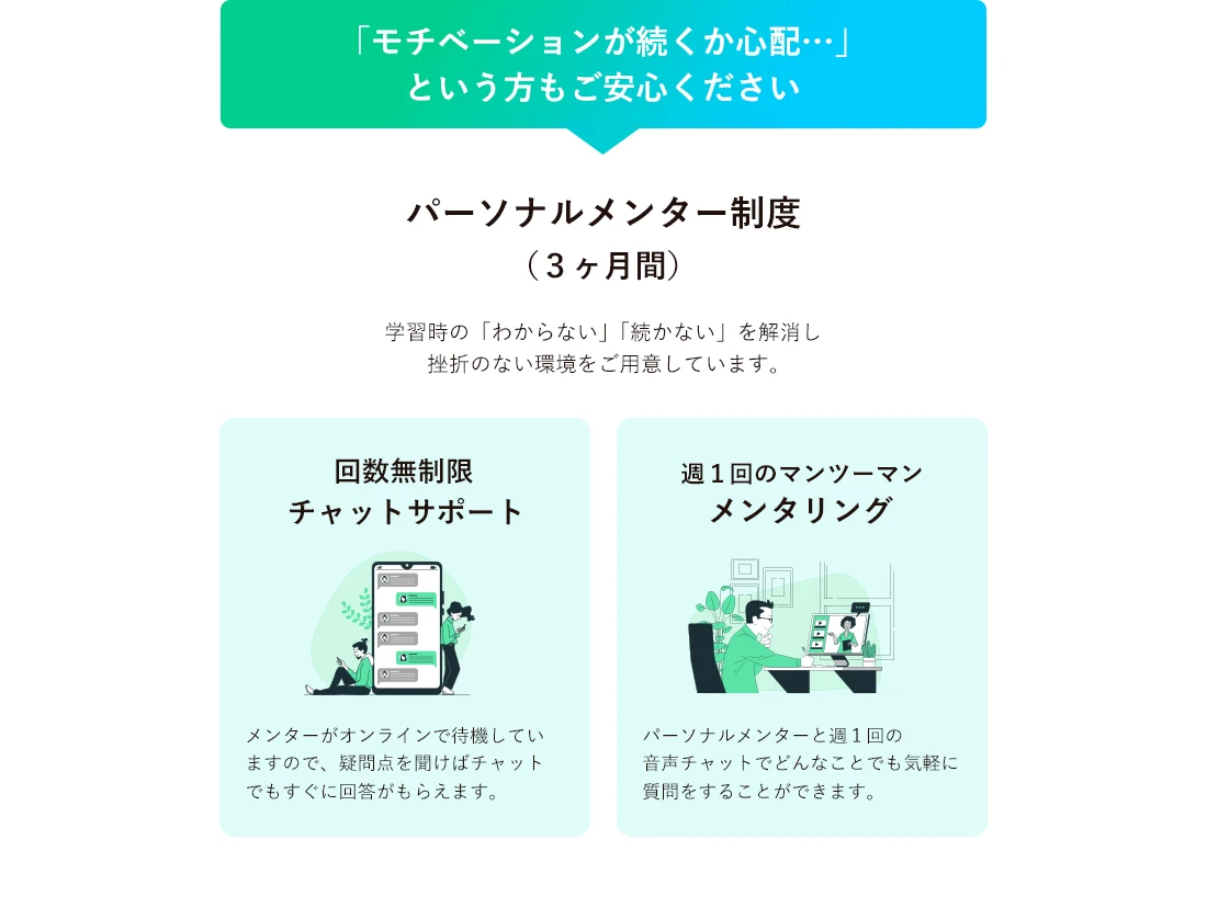 また最先端チャットボットによる24時間サポート体制やパーソナルメンター制度もございますので、挫折することなくスキル習得ができます。